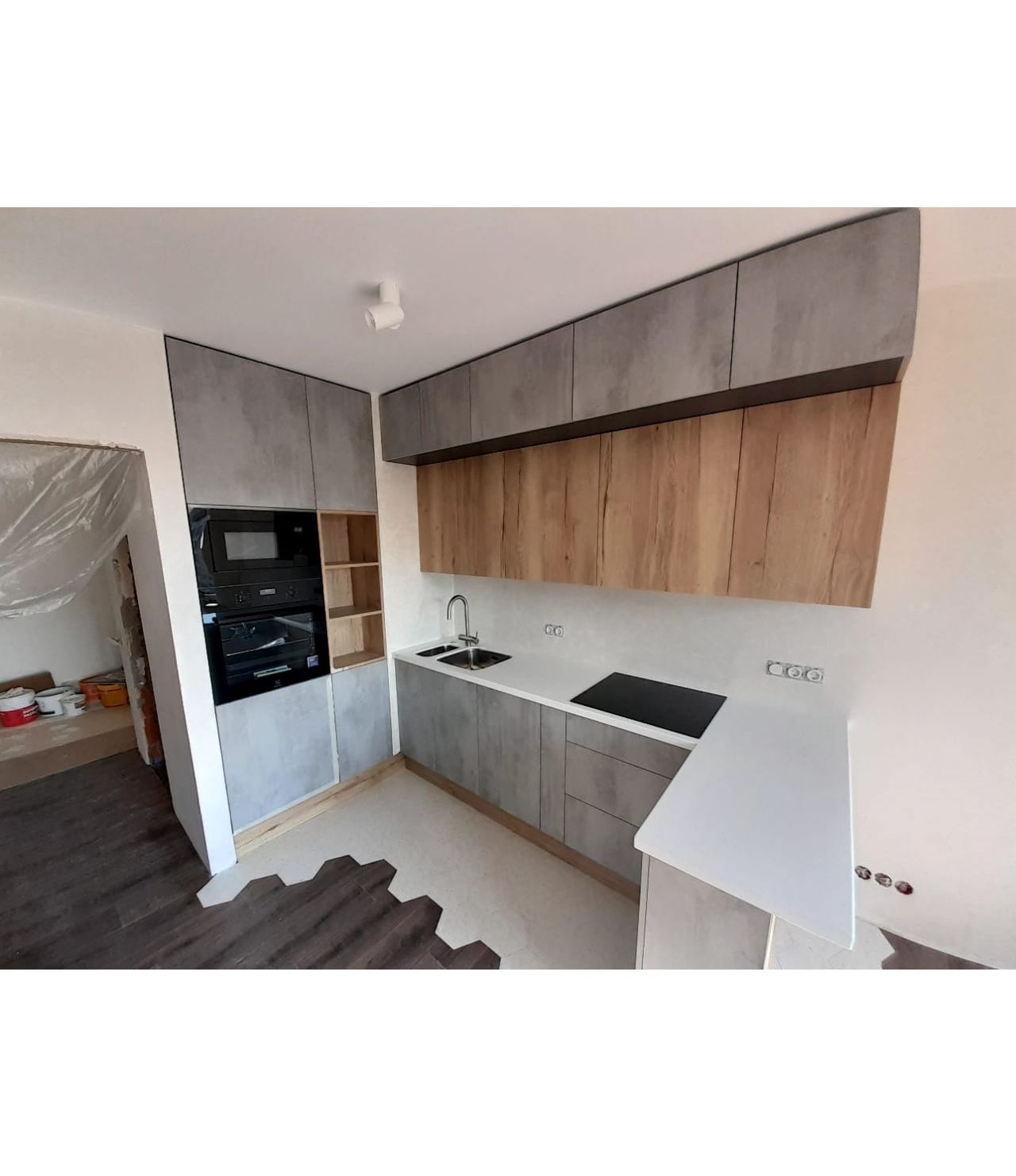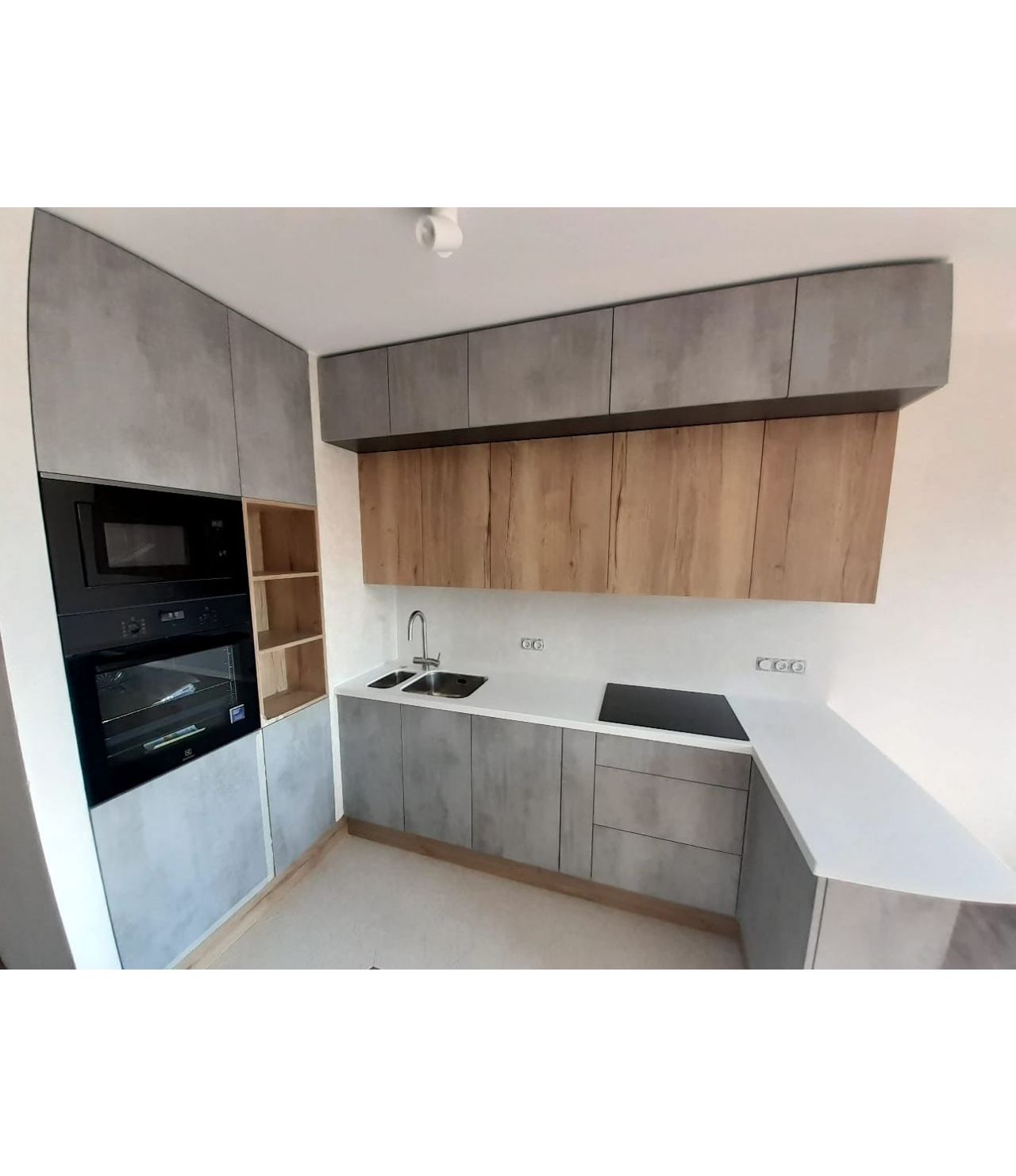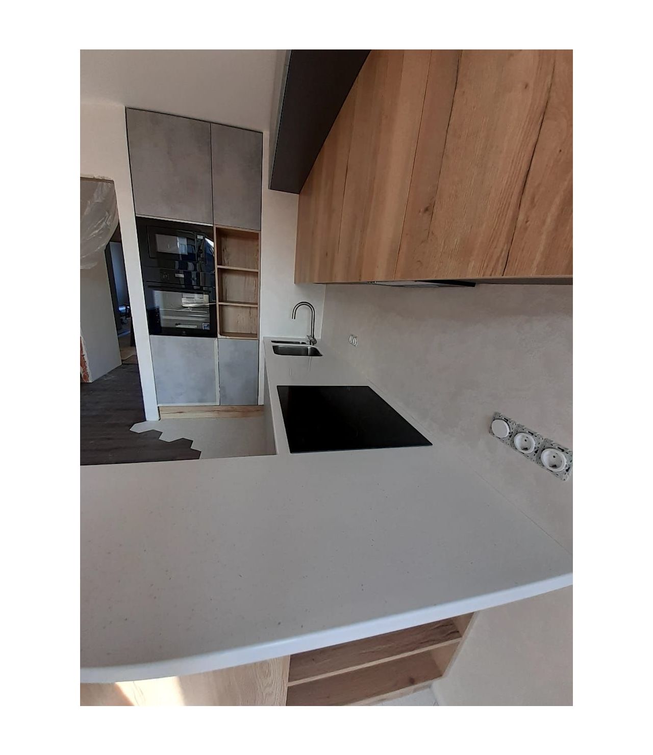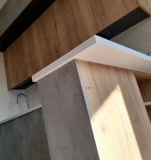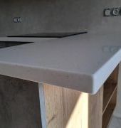 Угловая столешница с увеличенным свесом, для удобства сидения, из камня GRANDEX, два выреза ( мойка и варочная поверхность ), мойка подстольного монтажа.