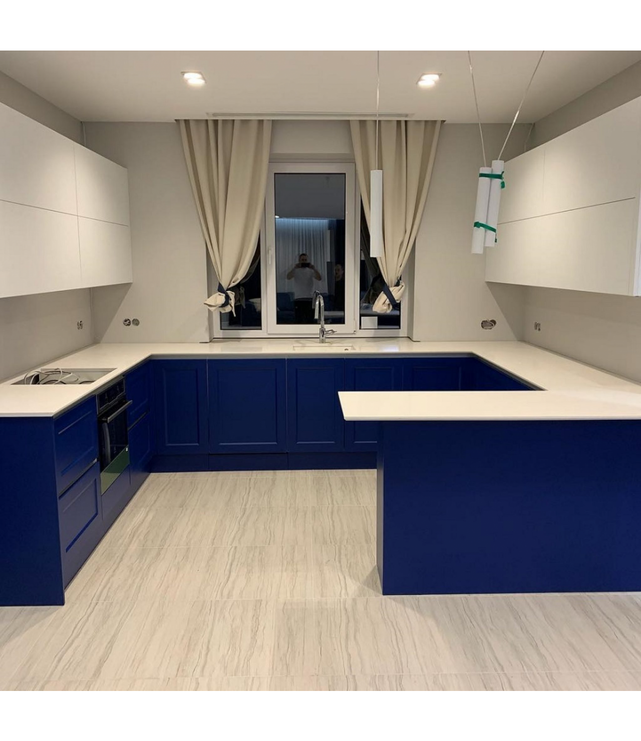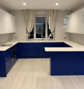Столешница, переходящая в подоконник, выполнена из искусственного камня GRANDEX , два выреза ( под мойку и варочную поверхность), мойка подстольного монтажа.