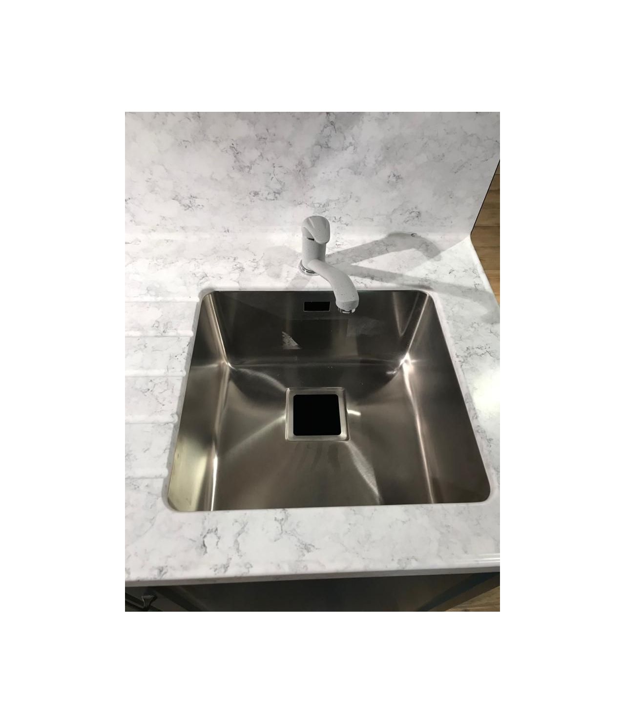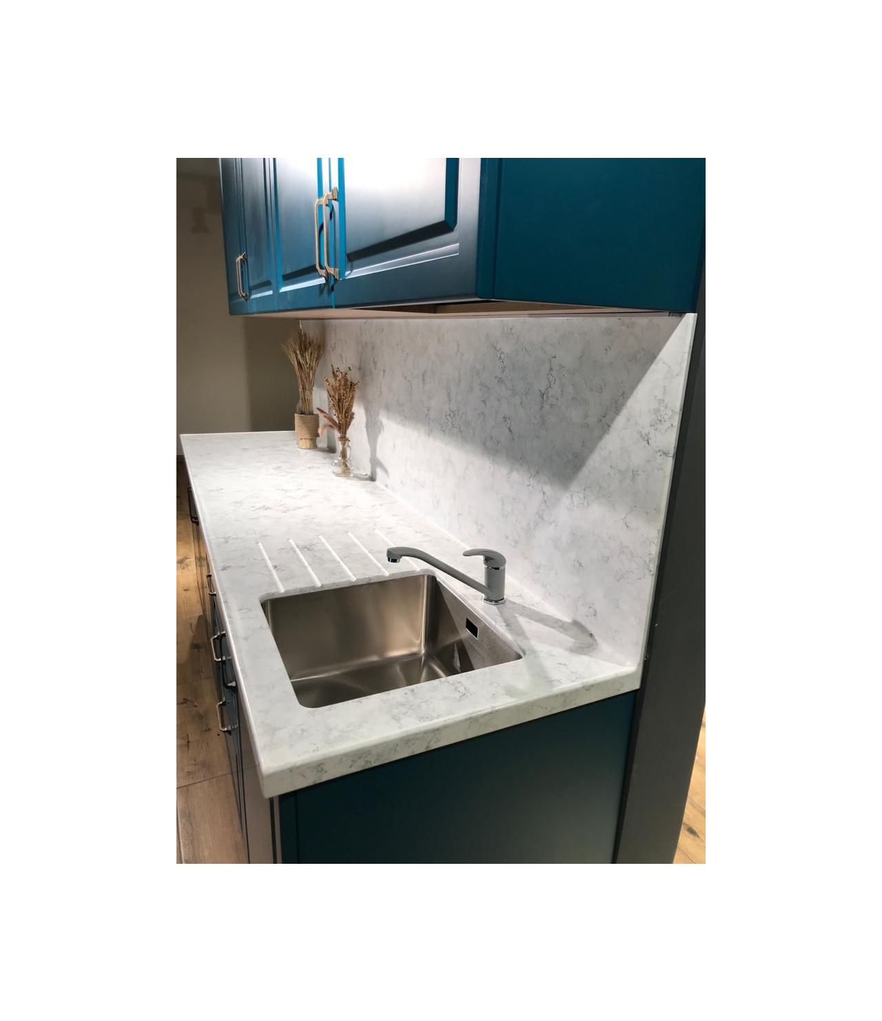 Столешница выполнена из искусственного камня NEOMARM , два выреза ( под мойку и варочную поверхность), металлическая мойка подстольного монтажа, проточки для стока воды. По переду столешницы кромка "непроливайка". Выполнен галтельный переход (плавный ) в стеновую панель.