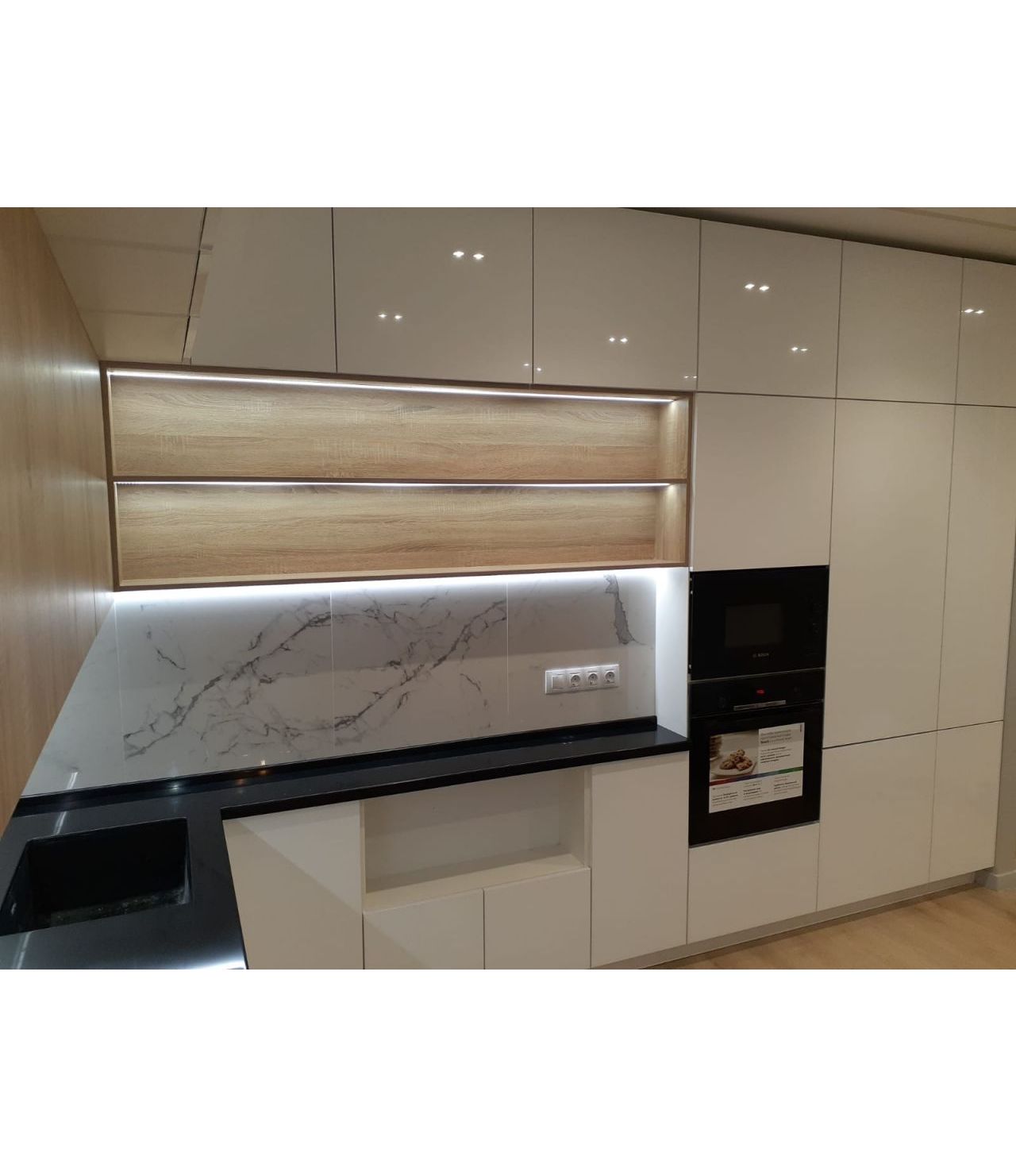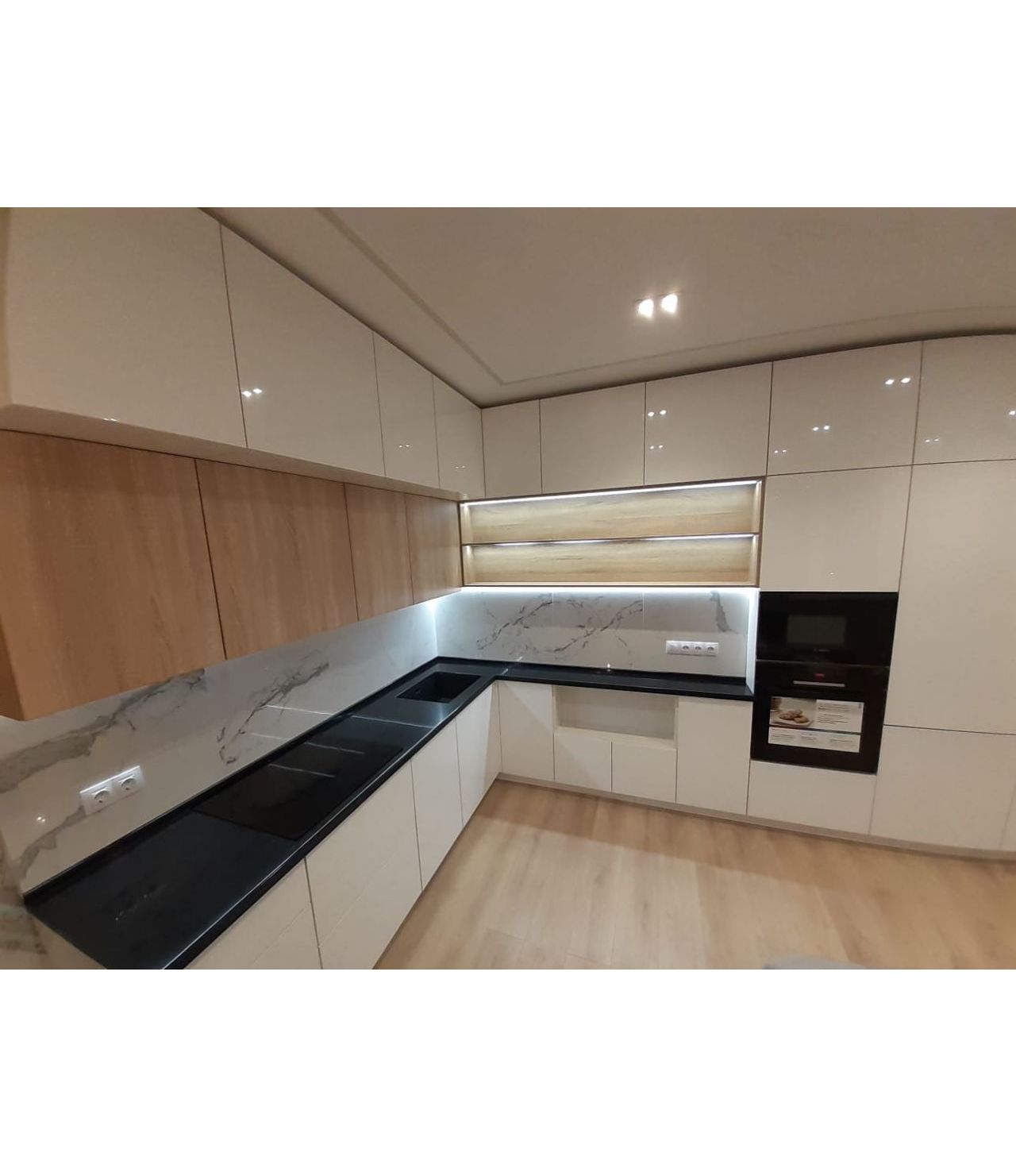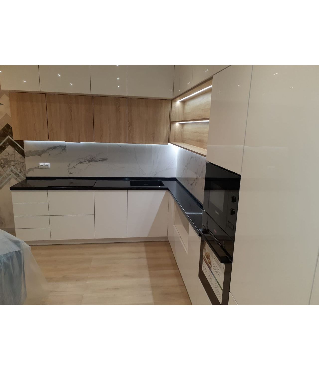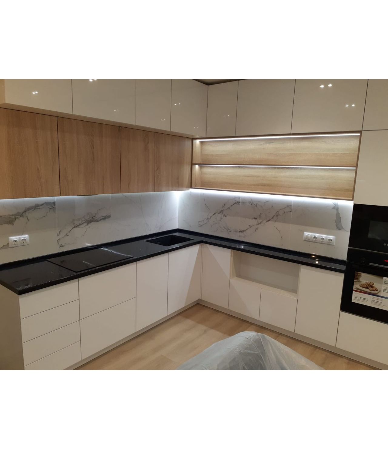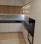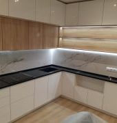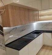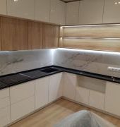 Столешница выполнена из искусственного камня GRANDEX Р-105, два выреза ( под мойку и варочную поверхность), мойка подстольного монтажа, пристеночный бортик под 900