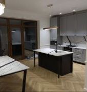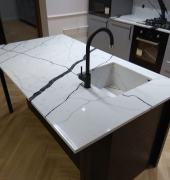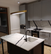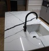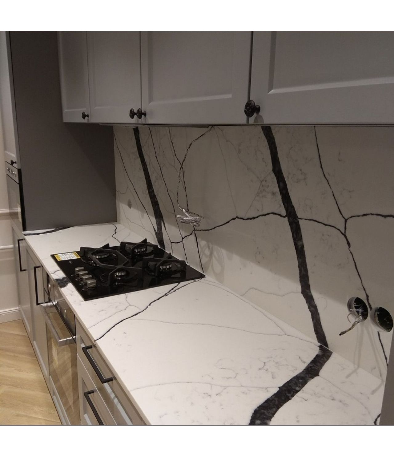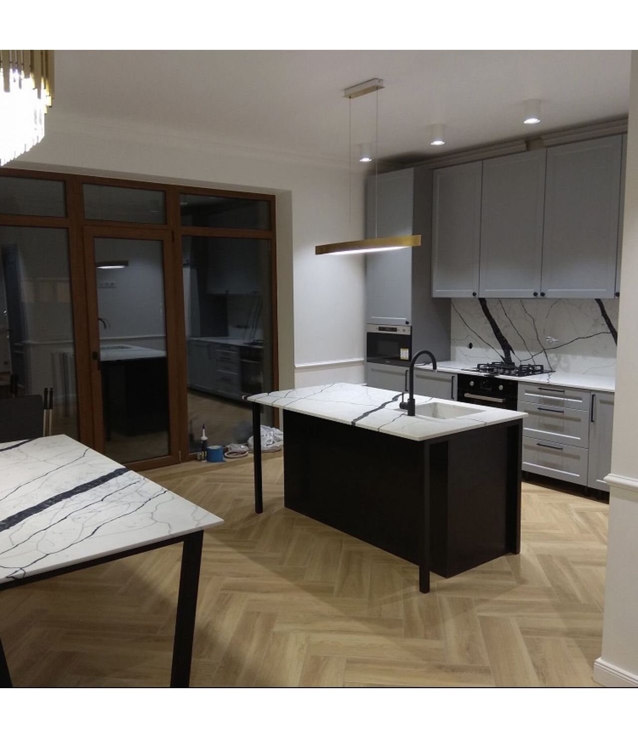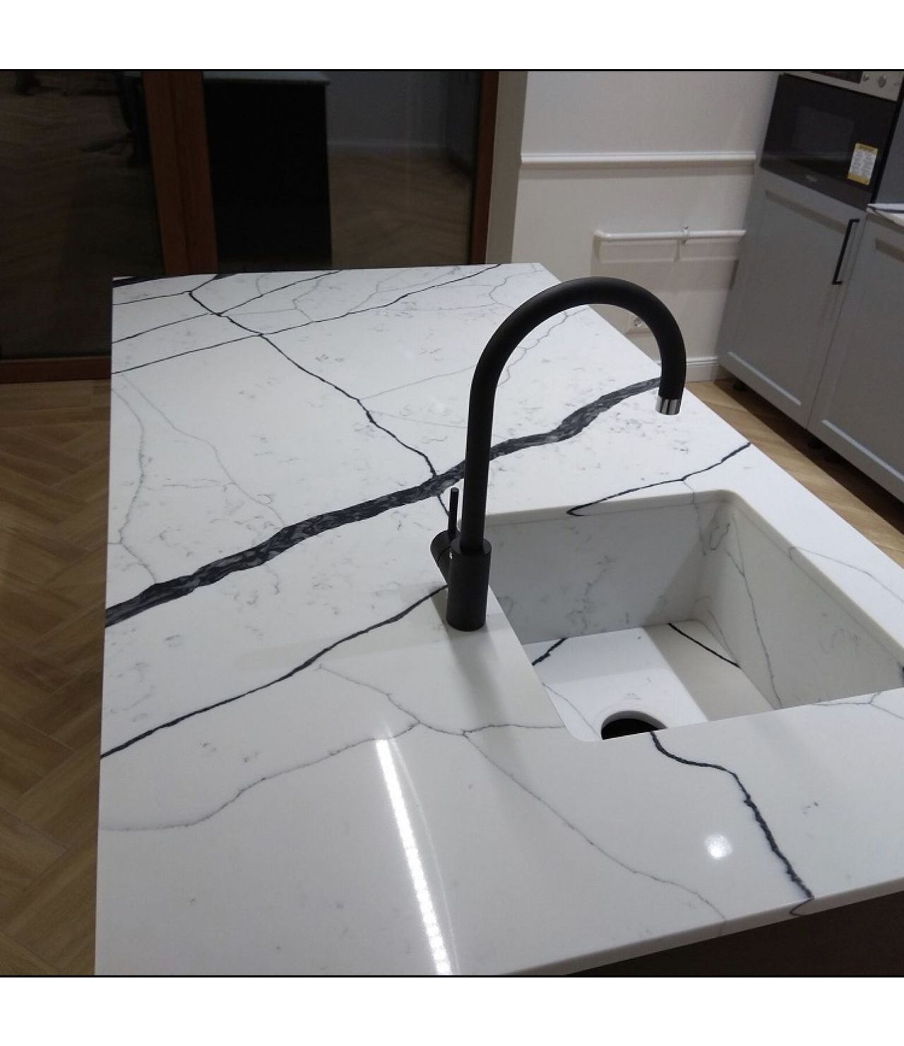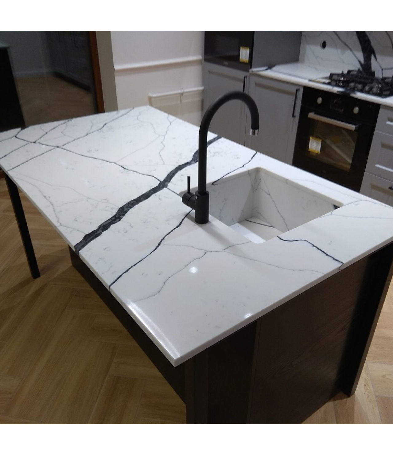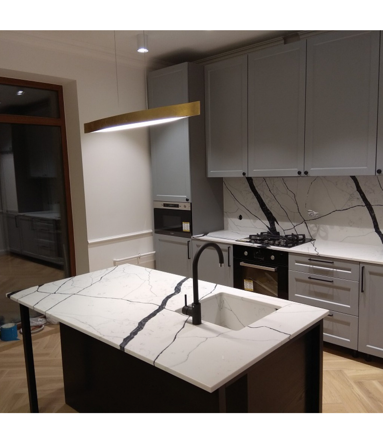 Столешница со стеновой панелью, столом и "островом" из кварца, Каллакатта Аяччо. Два выреза под мойку и варочную поверхность. Мойка подстольного монтажа. Мойка выполнена из камня.