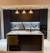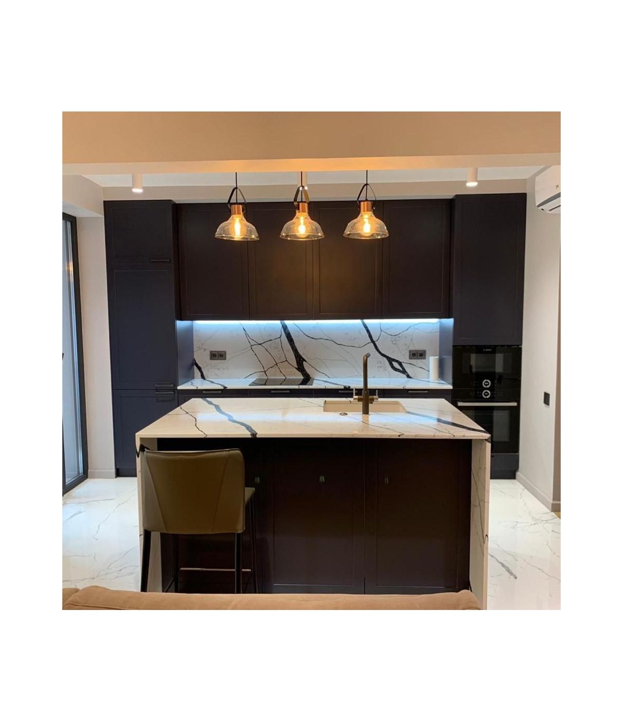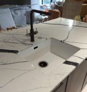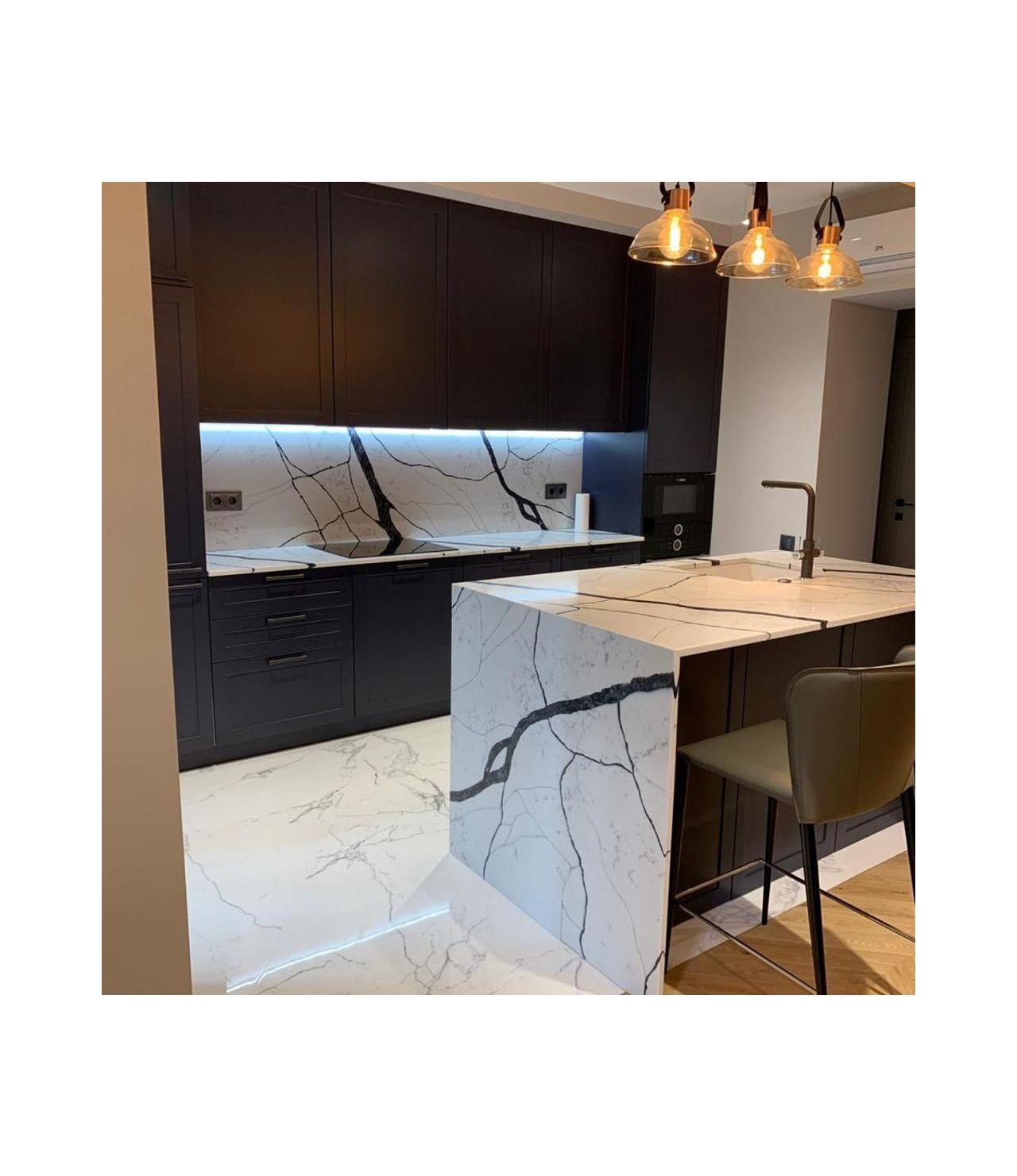Столешница прямая со стеновой панелью и "островом" из кварца, Каллакатта Аяччо. Два выреза под мойку и варочную поверхность. Мойка подстольного монтажа.