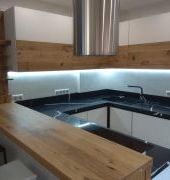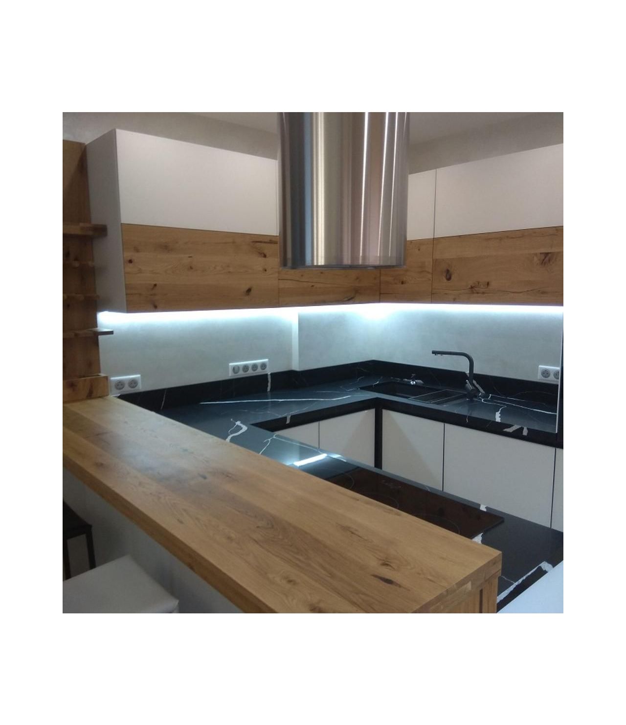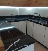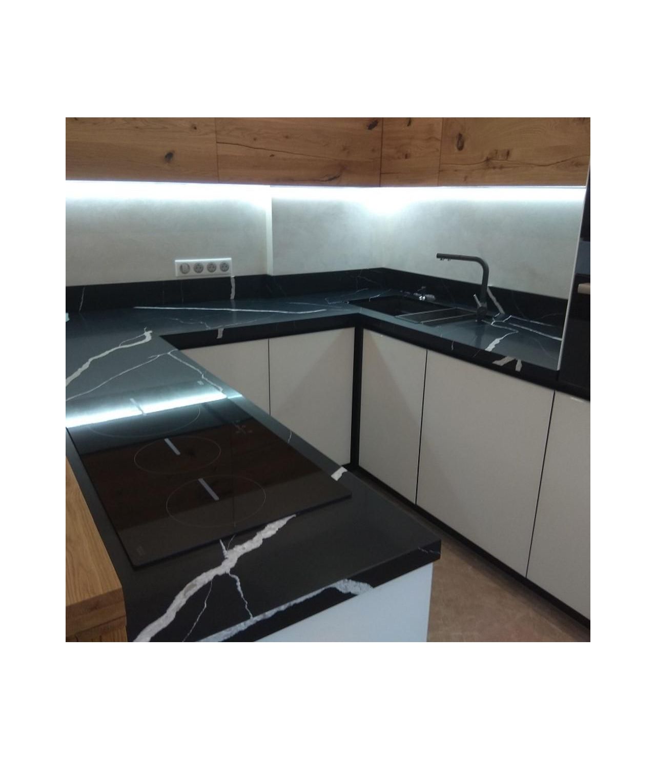 Столешница из кварца, Avant Quartz 7600 Калакатта ле Нор . Два выреза под мойку и варочную поверхность. Мойка большая, подстольного монтажа. Борт пристеночный 100 мм.