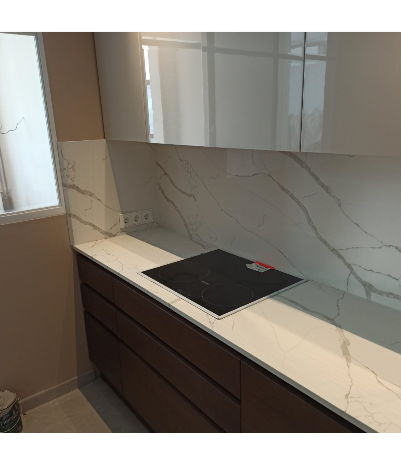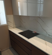 Столешница со стеновой панелью из кварца. Два выреза под мойку и варочную поверхность. Мойка накладная.