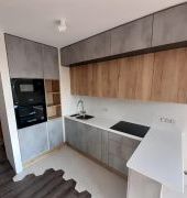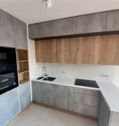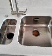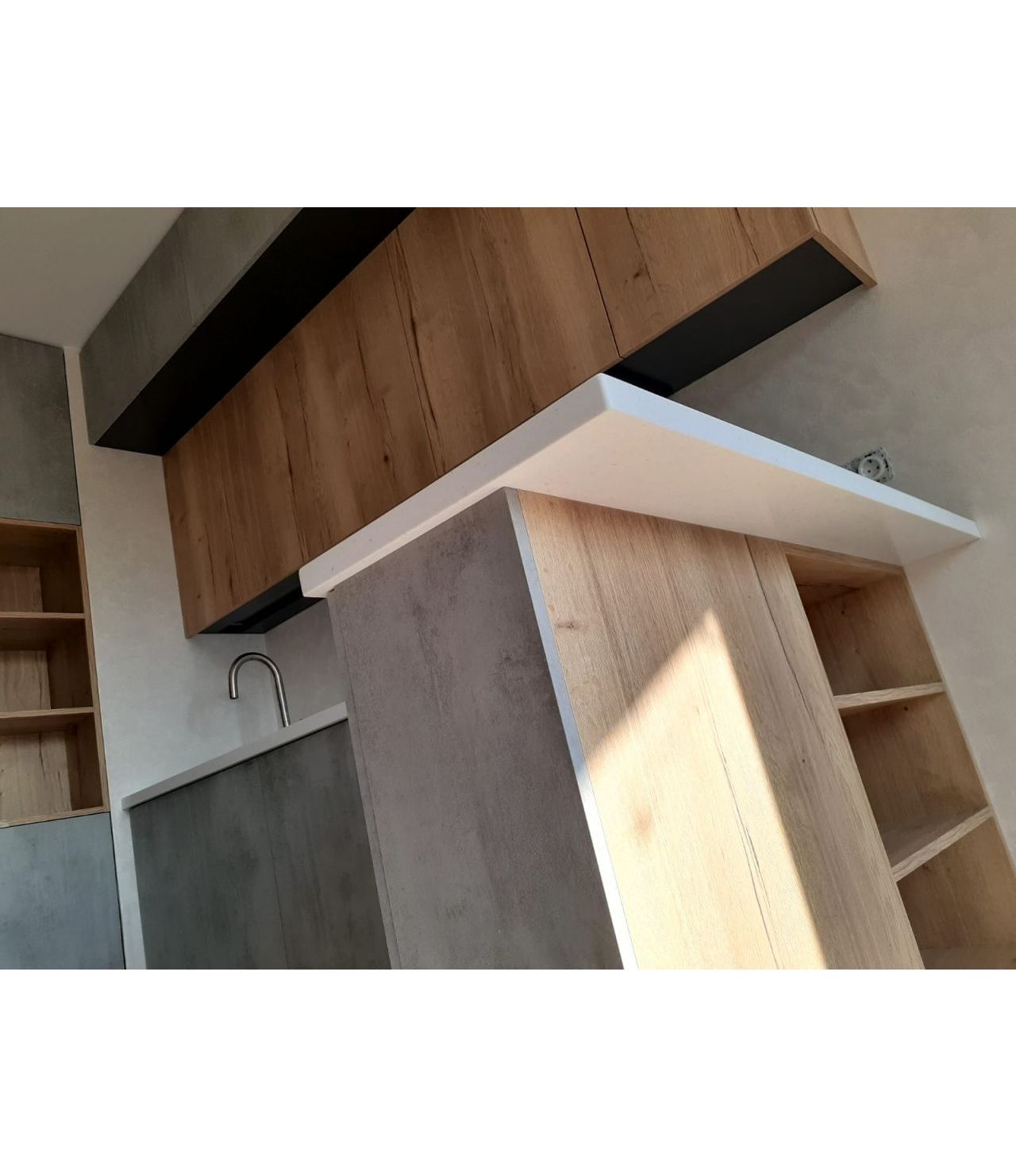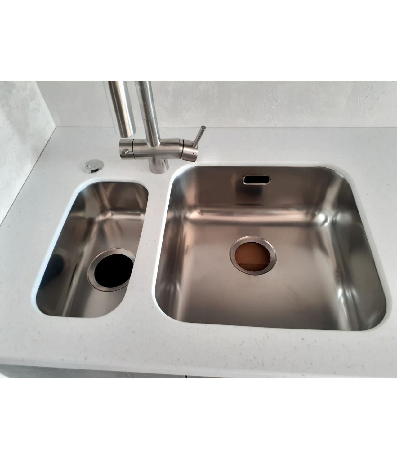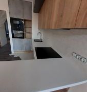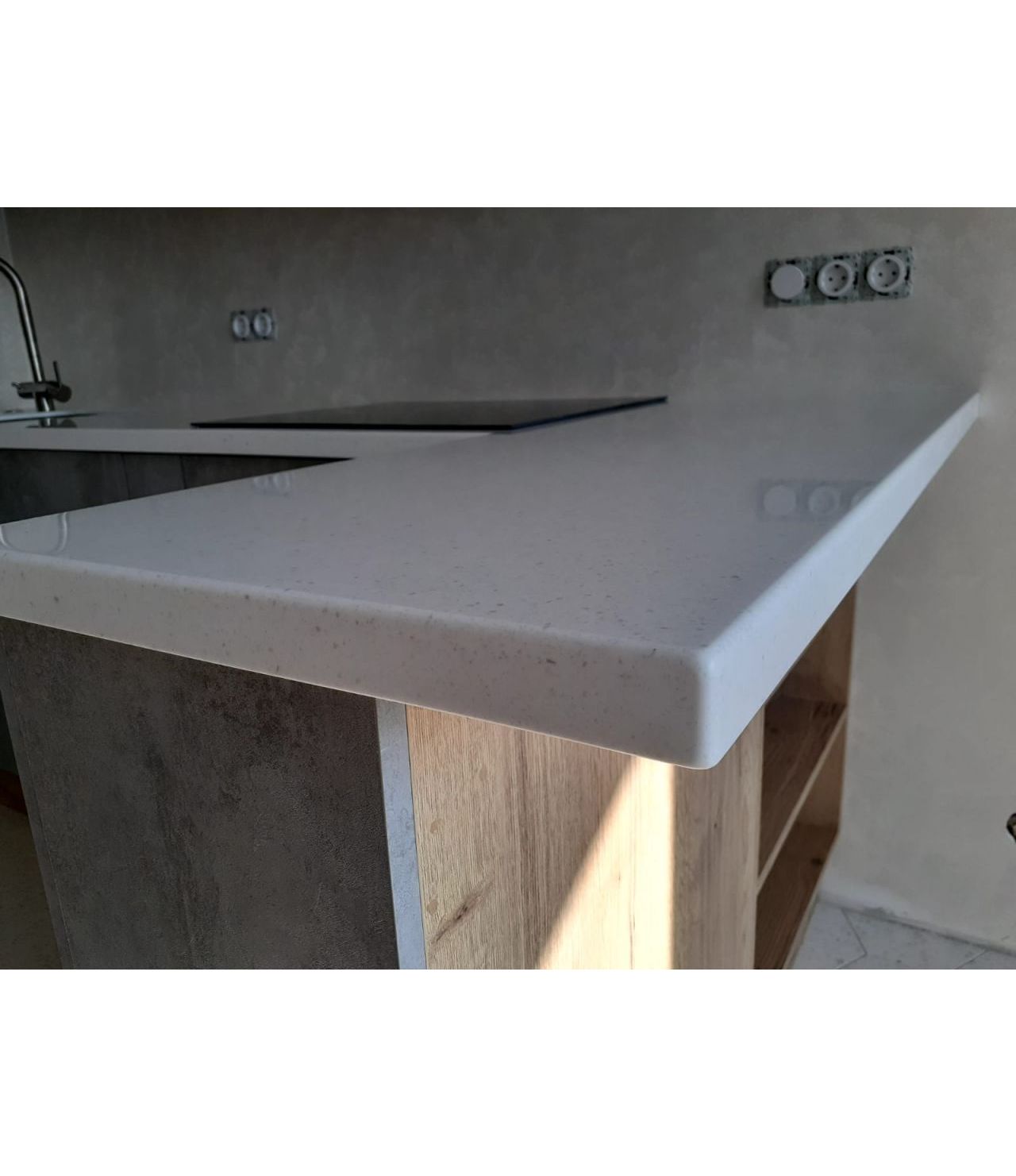 Угловая столешница с увеличенным свесом, для удобства сидения, из камня GRANDEX, два выреза ( мойка и варочная поверхность ), мойка подстольного монтажа.