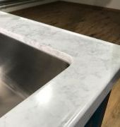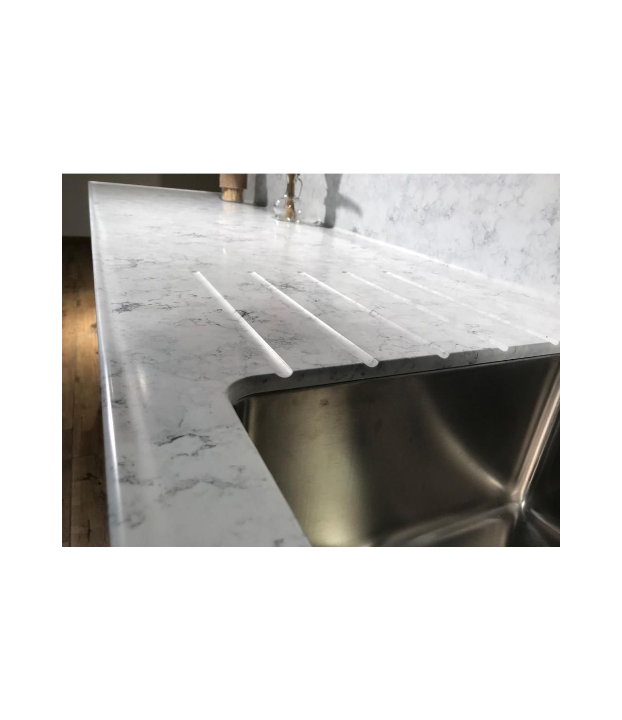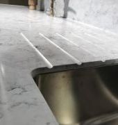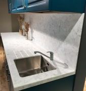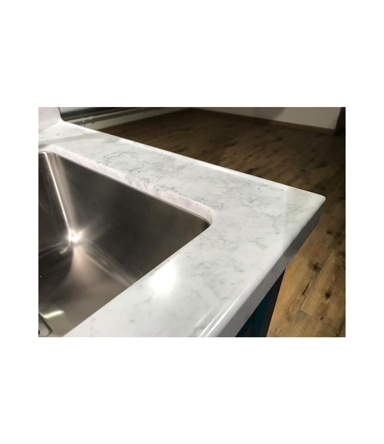 Столешница выполнена из искусственного камня NEOMARM , два выреза ( под мойку и варочную поверхность), металлическая мойка подстольного монтажа, проточки для стока воды. По переду столешницы кромка "непроливайка". Выполнен галтельный переход (плавный ) в стеновую панель.