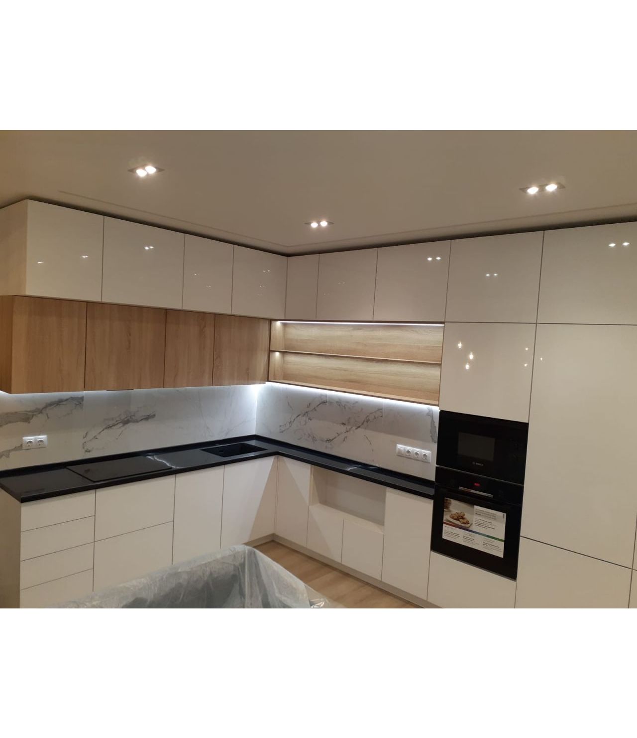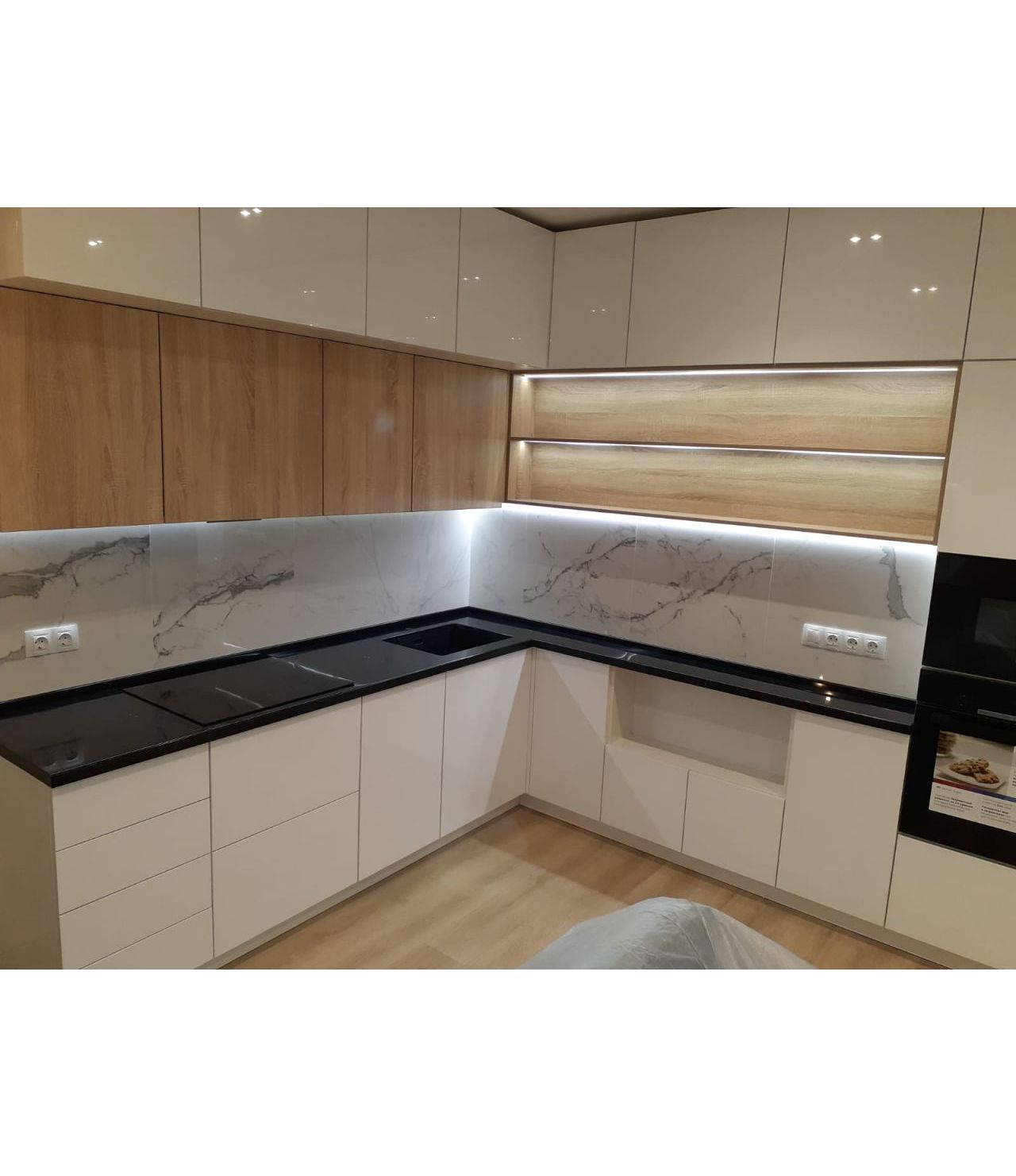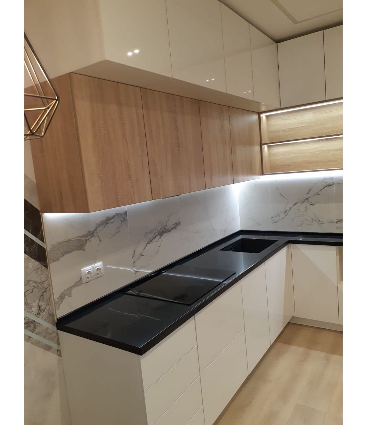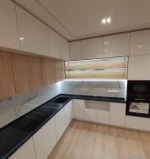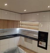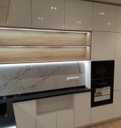 Столешница выполнена из искусственного камня GRANDEX Р-105, два выреза ( под мойку и варочную поверхность), мойка подстольного монтажа, пристеночный бортик под 900