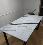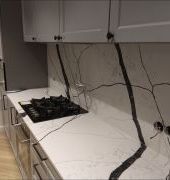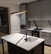 Столешница со стеновой панелью, столом и "островом" из кварца, Каллакатта Аяччо. Два выреза под мойку и варочную поверхность. Мойка подстольного монтажа. Мойка выполнена из камня.