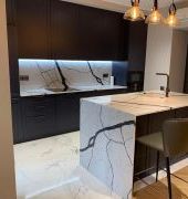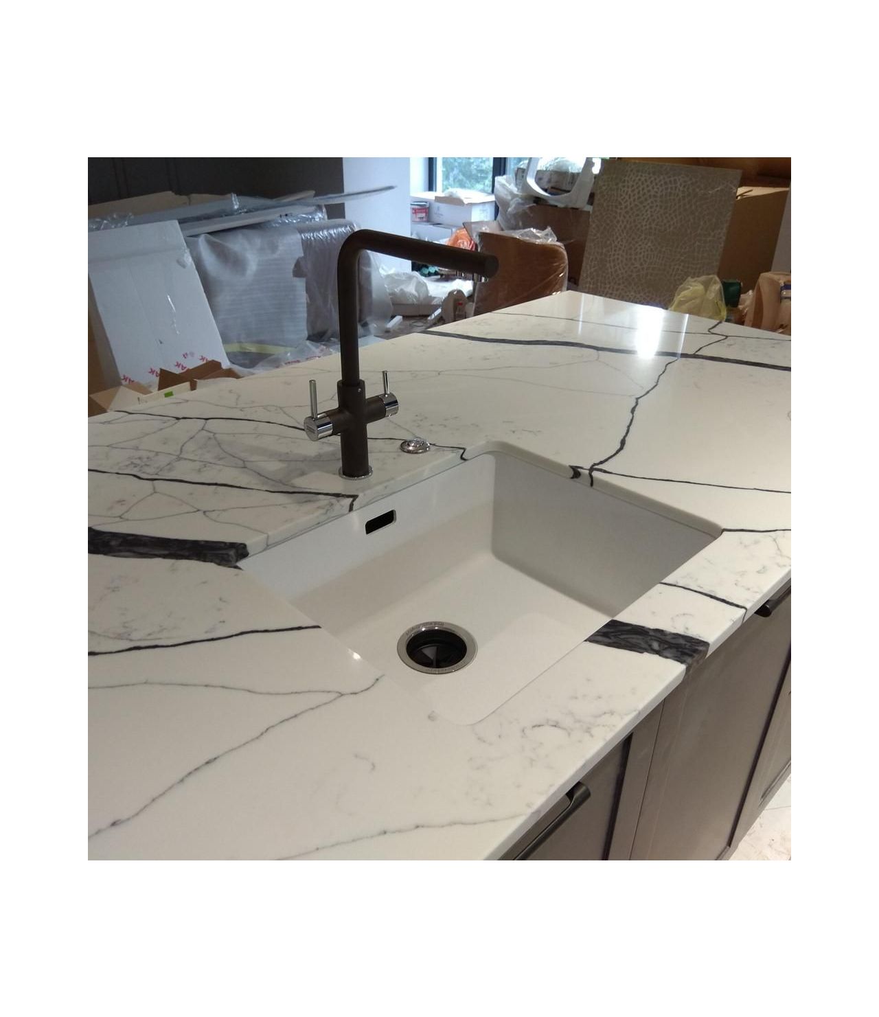 Столешница прямая со стеновой панелью и "островом" из кварца, Каллакатта Аяччо. Два выреза под мойку и варочную поверхность. Мойка подстольного монтажа.