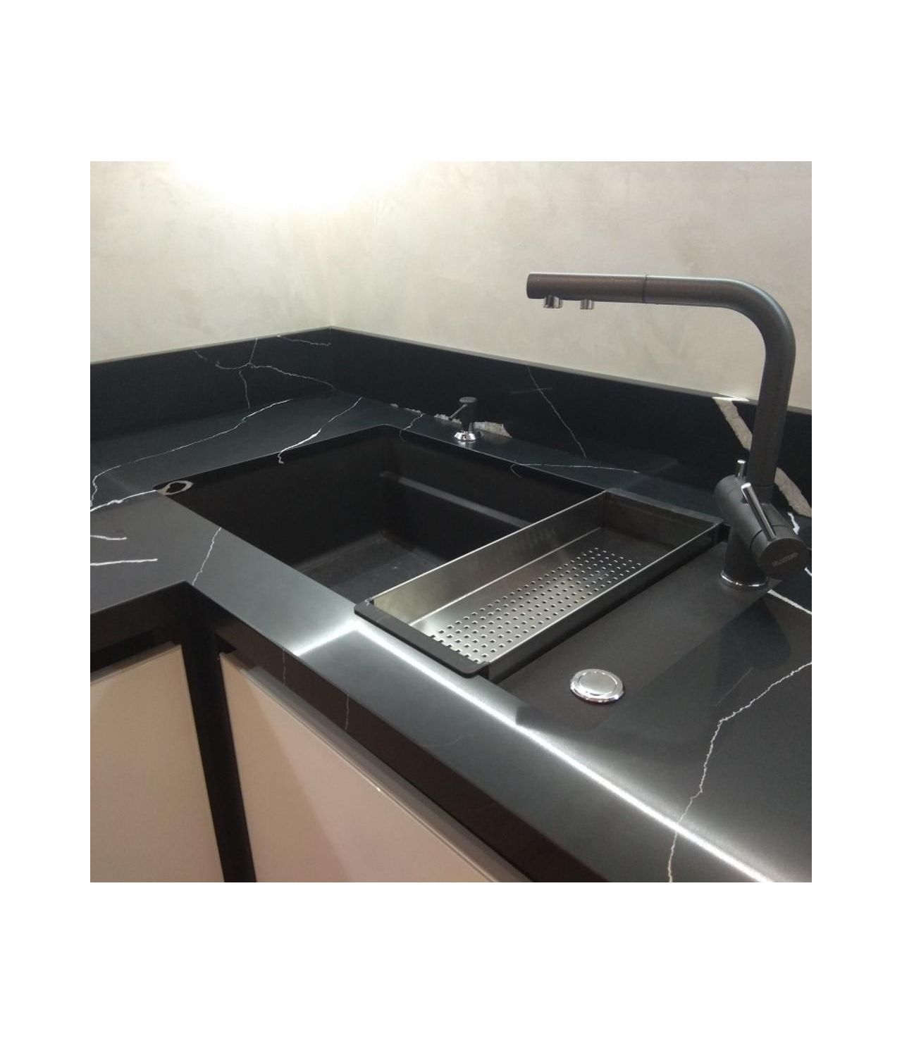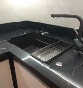 Столешница из кварца, Avant Quartz 7600 Калакатта ле Нор . Два выреза под мойку и варочную поверхность. Мойка большая, подстольного монтажа. Борт пристеночный 100 мм.