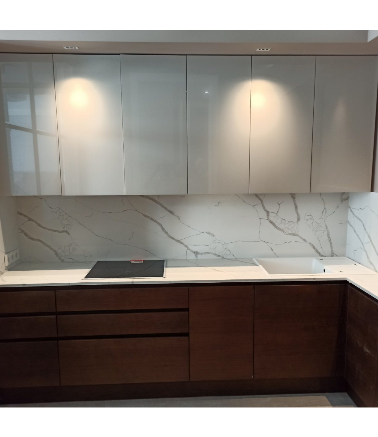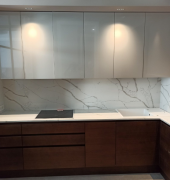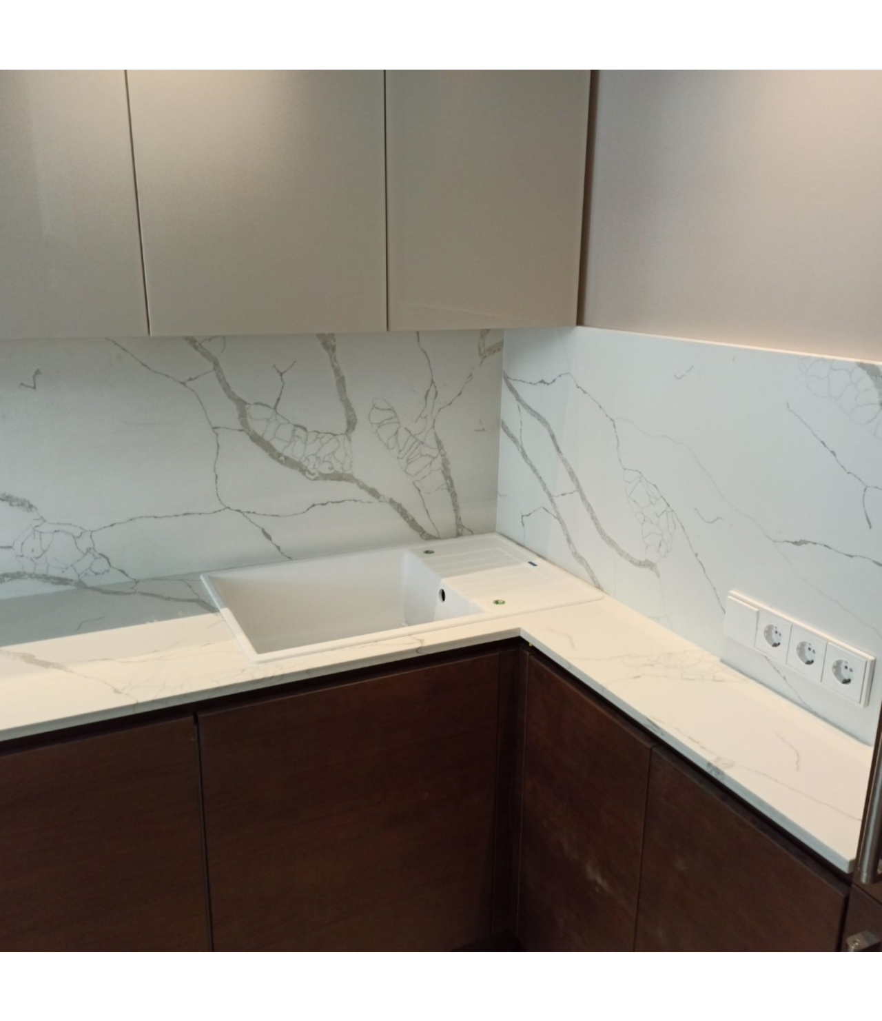 Столешница со стеновой панелью из кварца. Два выреза под мойку и варочную поверхность. Мойка накладная.